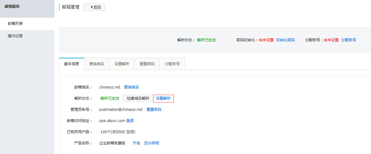 2.在郵箱管理列表中點擊要設置解析的郵箱域名右邊的【管理】,進入詳細頁后點擊【設置解析】—【一鍵添加郵箱解析】。