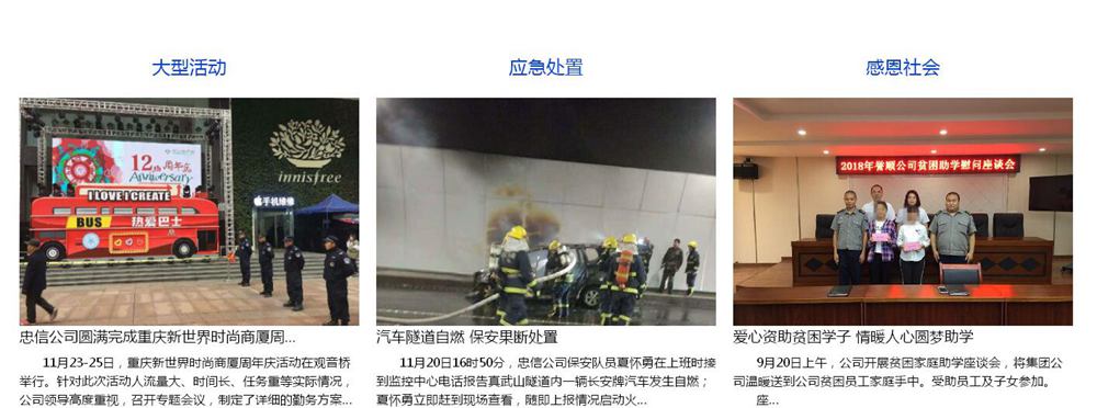 集團(tuán)公司業(yè)務(wù)范圍:為重慶市黨政機(jī)關(guān)、水、電、氣、通訊、教育、醫(yī)療、軌道、機(jī)場、大型商場等關(guān)系國計民生的重點(diǎn)要害部位提供保安服務(wù)和治安巡邏。并從事機(jī)動車號牌生產(chǎn)、駕駛?cè)丝荚嚺嘤?xùn)、機(jī)動車檢驗檢測、保安人員考試培訓(xùn)等業(yè)務(wù)。