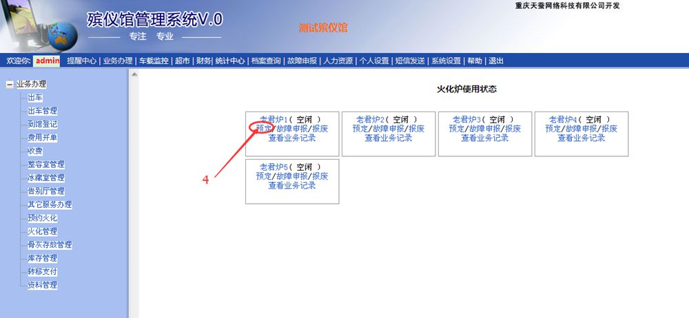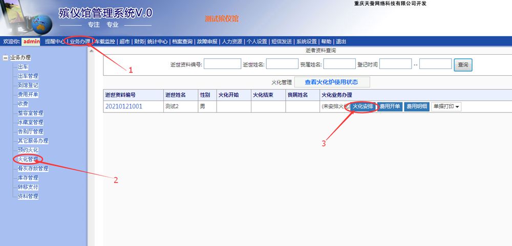 1、點擊“業(yè)務辦理”—>2、點擊“火化管理”—>3、點擊“火化安排”