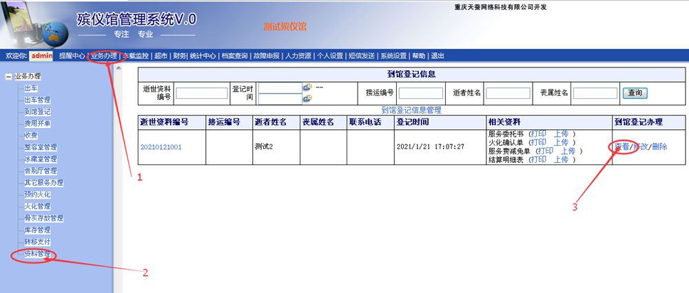 1、點擊“業(yè)務辦理”—>2、點擊“資料管理”—>3、點擊“查看”(找到對應的逝者資料)