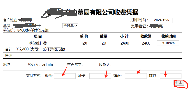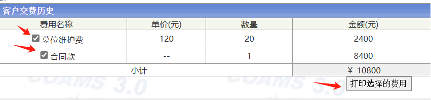 1. 多條收費(fèi)記錄打印到一條收據(jù)上,操作步驟:資料查詢/查看/客戶交費(fèi)記錄/“勾選打印條目”,點(diǎn)打印即可,如下示例圖: