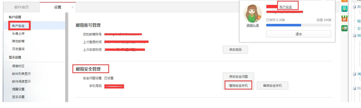 點擊頭像的帳號安全,進入郵箱安全管理,點擊"替換安全手機",通過安全問題驗證即可.