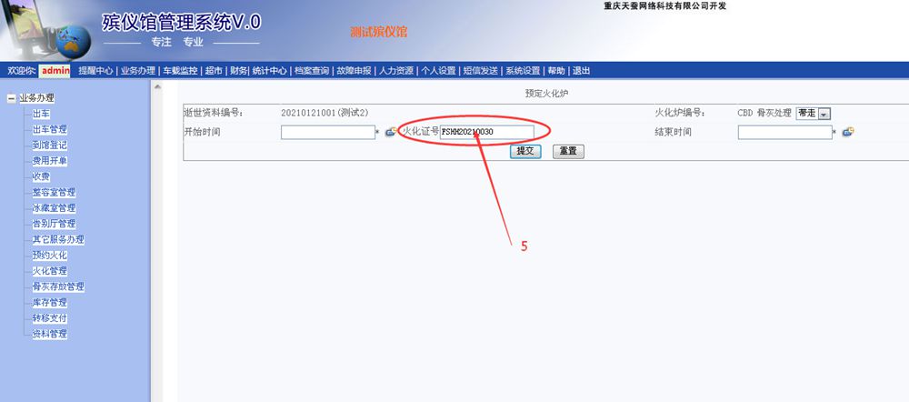 我們只需要將剛火化的業務,在結束時,產生的火化證編號修改成釋放出來的編號就可以了。如何添加火化證編號呢?詳細步驟如下: